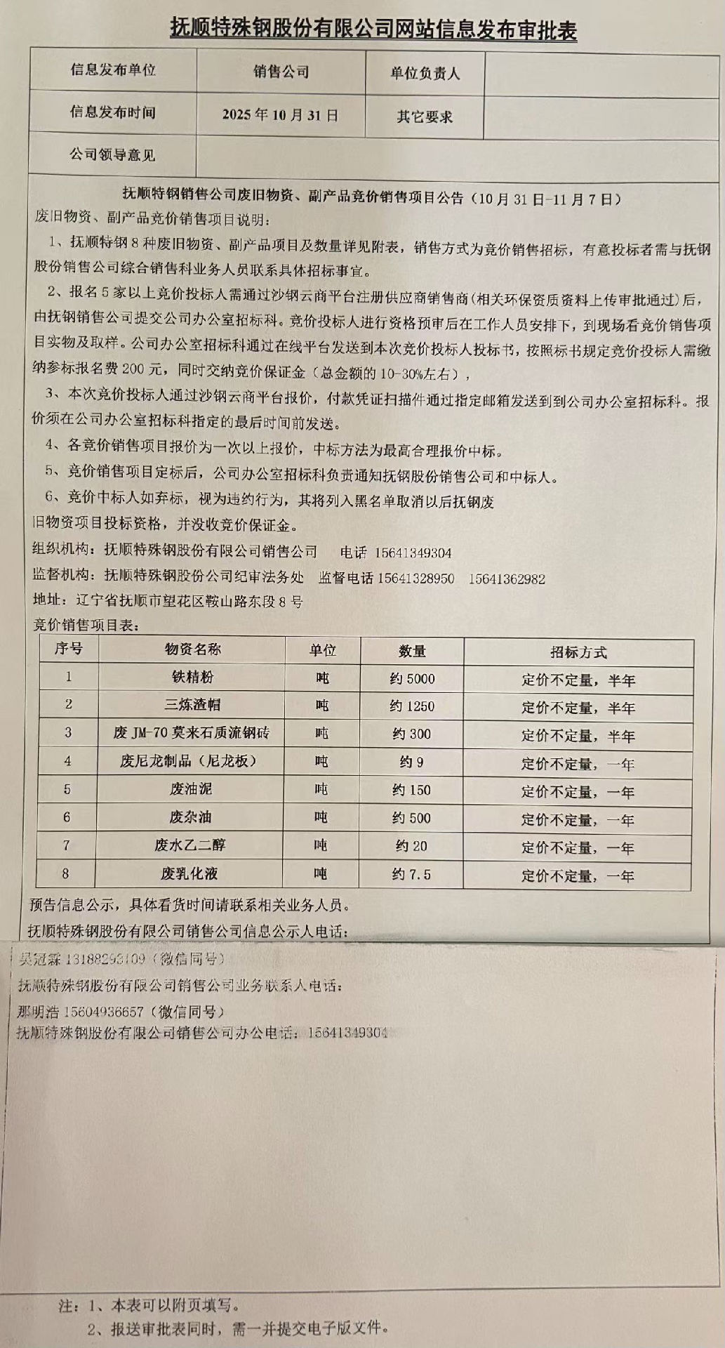 撫順特鋼銷(xiāo)售公司廢舊物資、副產(chǎn)品競(jìng)價(jià)銷(xiāo)售項(xiàng)目公告(10月31日-11月7日