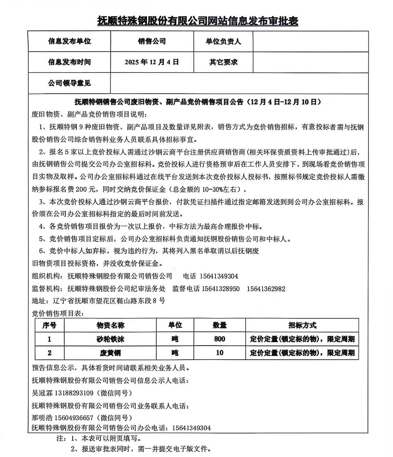撫順特鋼銷售公司廢舊物資、副產(chǎn)品競(jìng)價(jià)銷售項(xiàng)目公告(12月4日-12月10日)