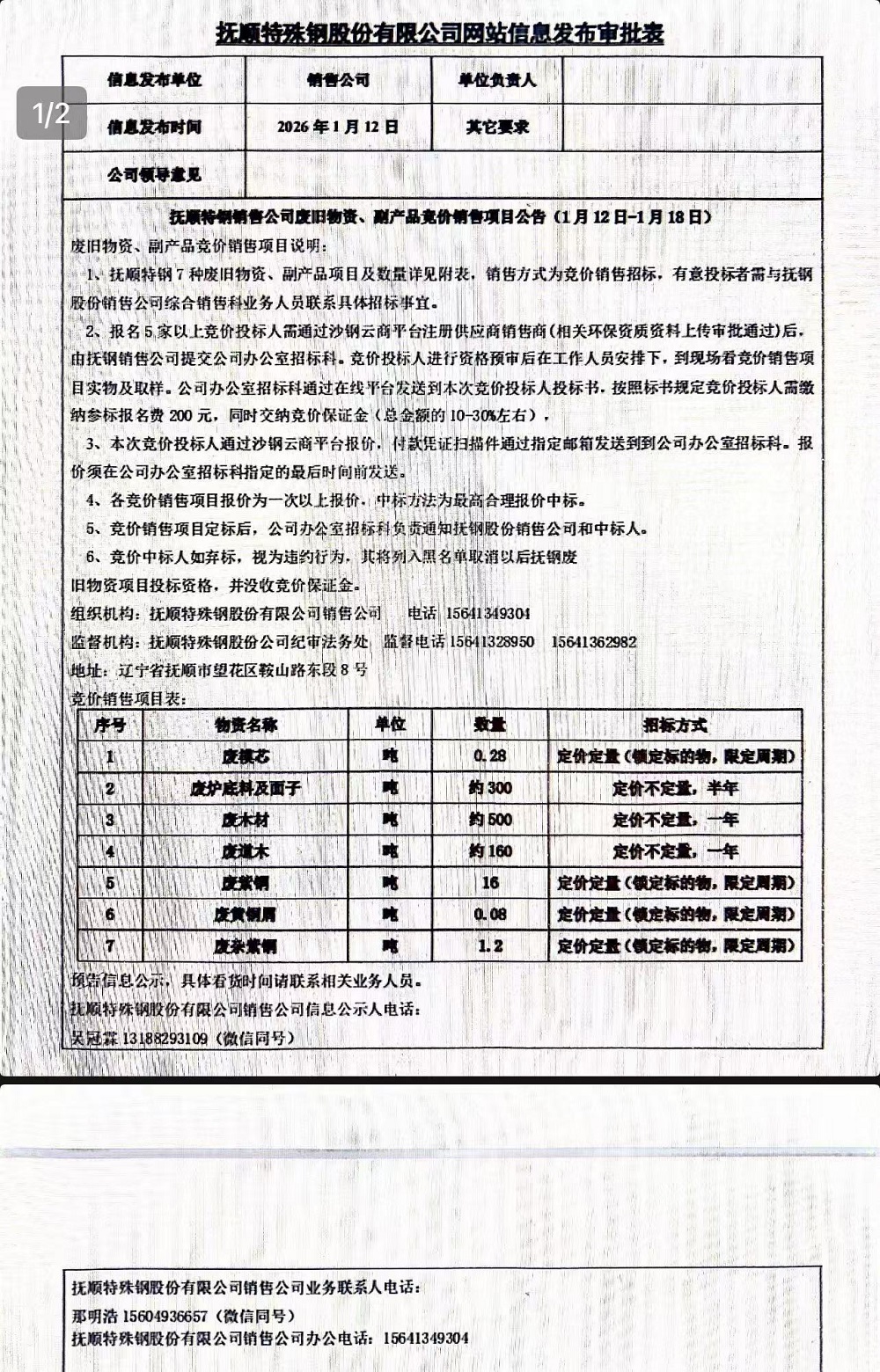 撫順特鋼銷售公司廢舊物資、副產(chǎn)品競(jìng)價(jià)銷售項(xiàng)目公告(1月12日-1月18日)