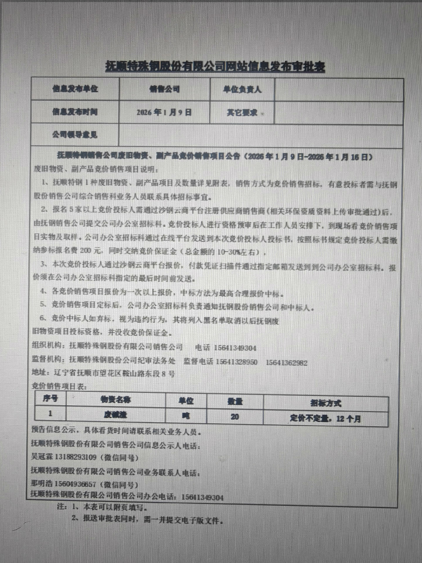 撫順特鋼銷售公司廢舊物資、副產(chǎn)品競(jìng)價(jià)銷售項(xiàng)目公告(1月9日-1月16日)