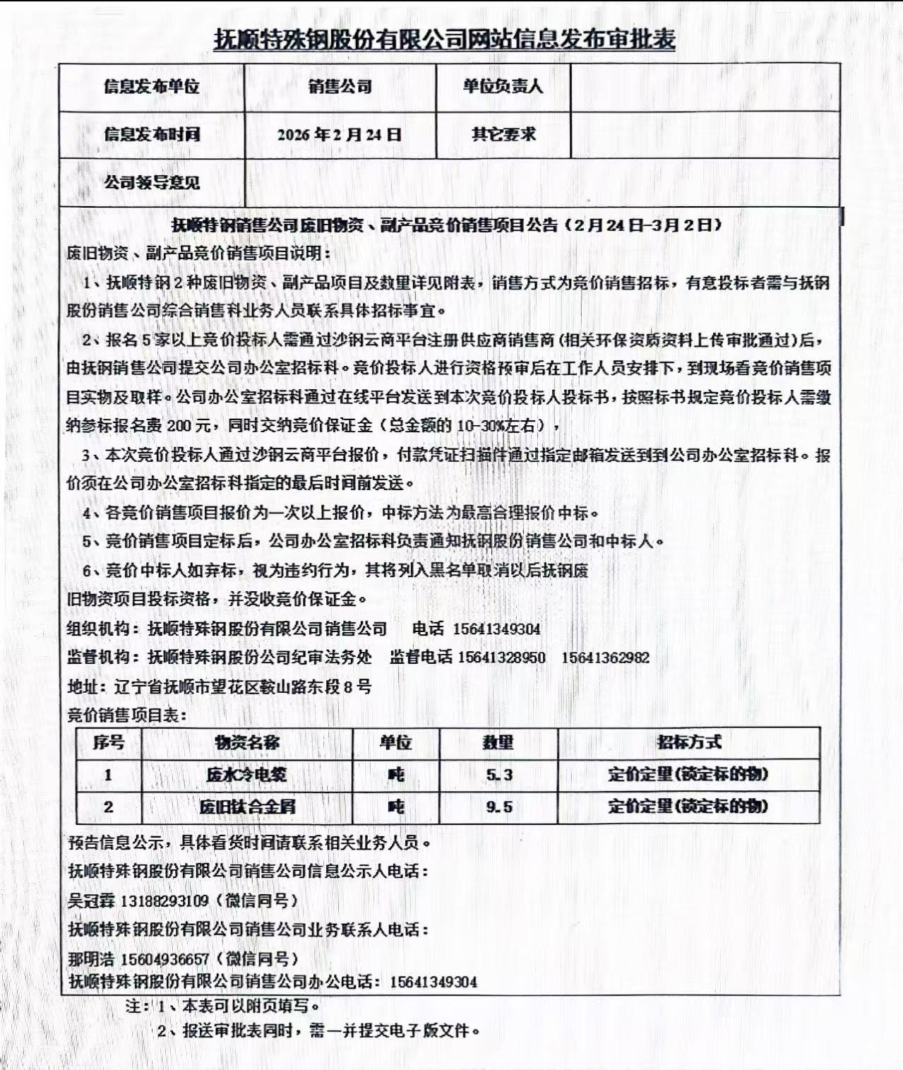 撫順特鋼銷售公司廢舊物資、副產(chǎn)品競價(jià)銷售項(xiàng)目公告(2月24日-3月2日)